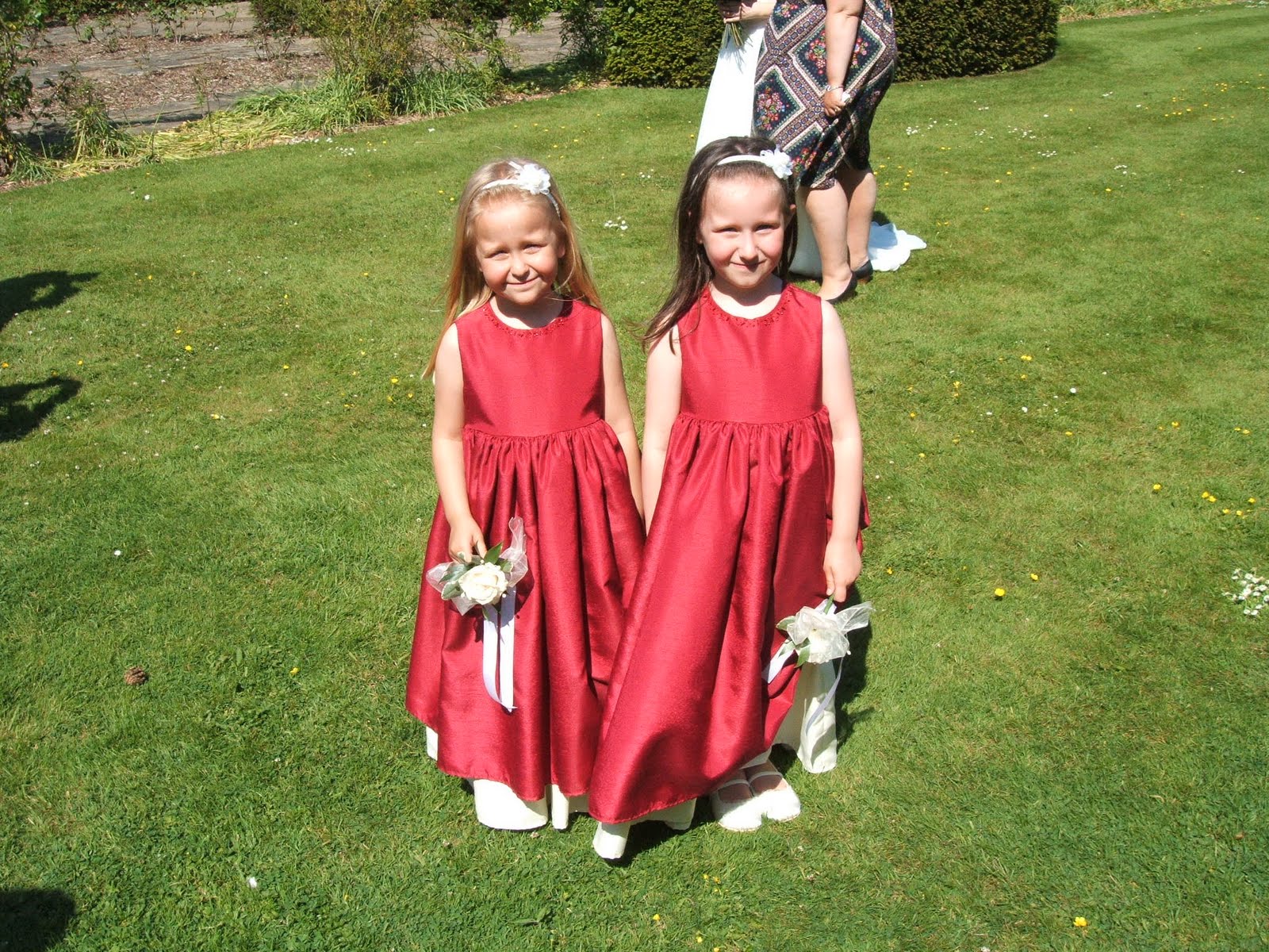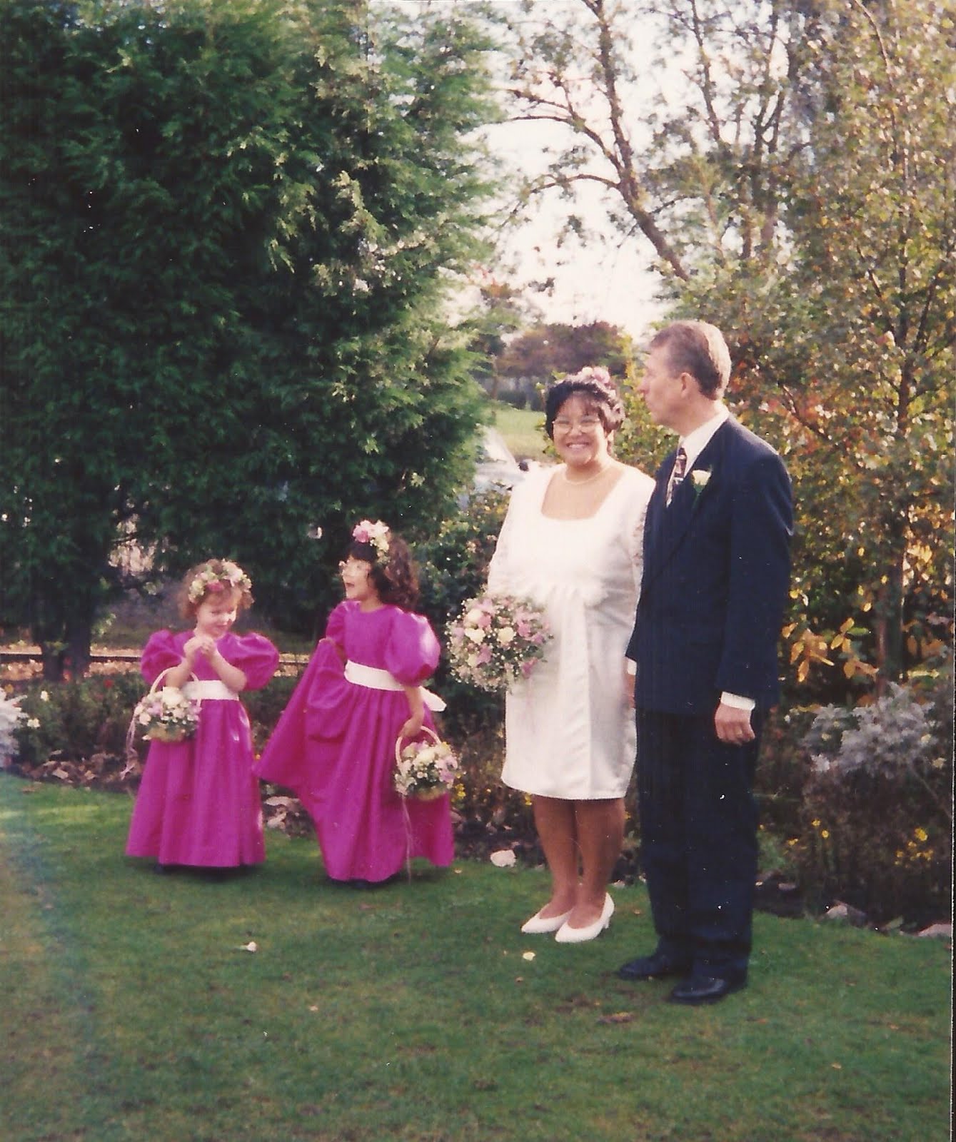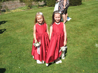 I made Linda's wedding dress in ivory duchess satin with lace overlay bodice and sleeves. She chose traditional style bridesmaid dresses in fuscia pink taffeta with ivory ribbons.